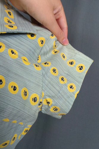 A classic 1950s cut, this cute cotton dress has those HUGE pockets that we now can only dream of. By Mercal Model, the grey background makes the yellow spots with black roses really pop, and the large black buttons are perfect to finish off. The cap sleeves and large pockets make the nipped waist look much smaller, giving you the silhouette of the era. It may be a little well loved, but there is still many years of wear left in it.
