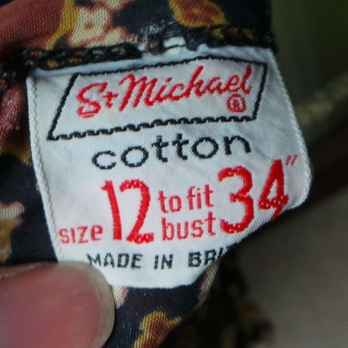 St Michael really did make some of the best vintage I have come across! This semi-sheer black and brown floral blouse has a touch of the boho prairie look, so it is great to wear with your long maxi skirts and denim flares, but is also smart enough to wear into the office. A tie at the neck and button down front lets you decide how revealing you want to make this great summer top.